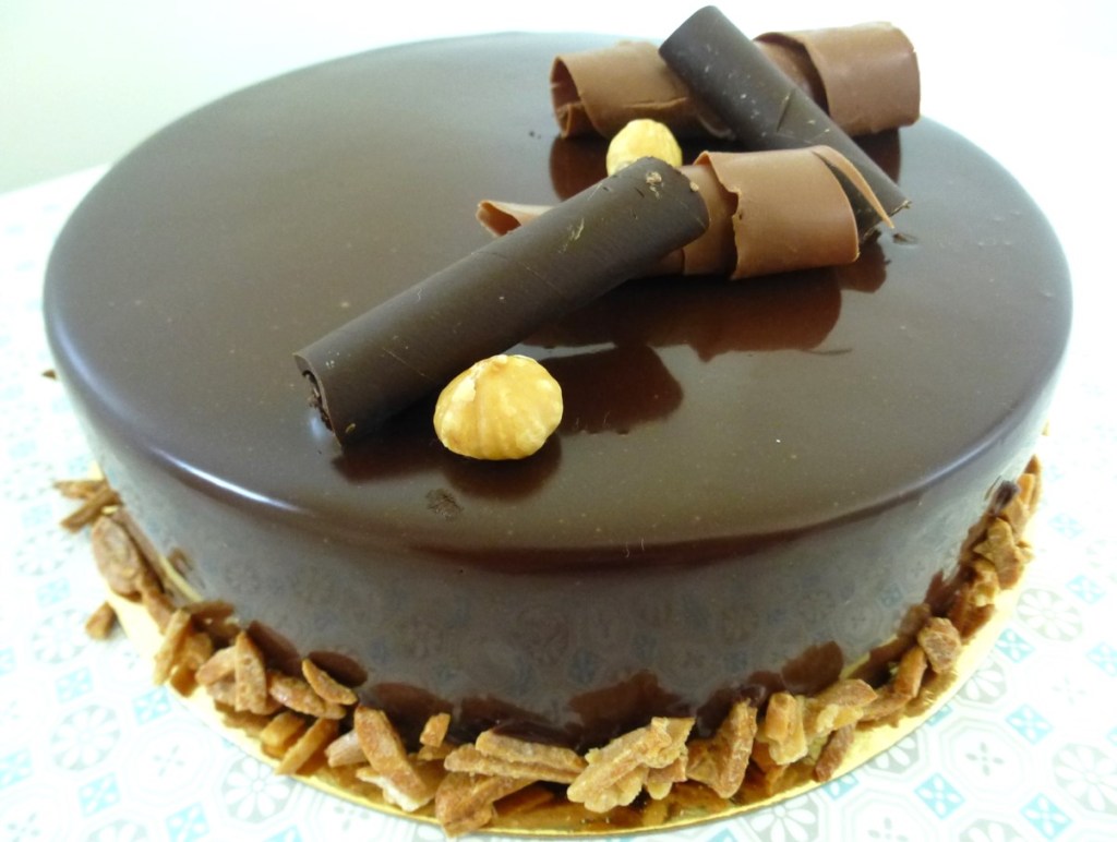 Mousse chocolat noir, crémeux chocolat lait, crème chocolat blanc, biscuit chocolat sans farine, croustillant praliné,